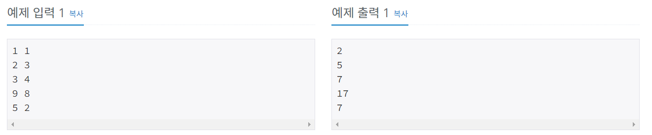이 문제는 10952번 덧셈문제와 거의 동일하지만, 입력이 종료되었다는 의미로 특정 입력값을 설정하는 것이 아니라 값이 더이상 없을때까지 덧셈을 계속한다는 차이점이 있다.