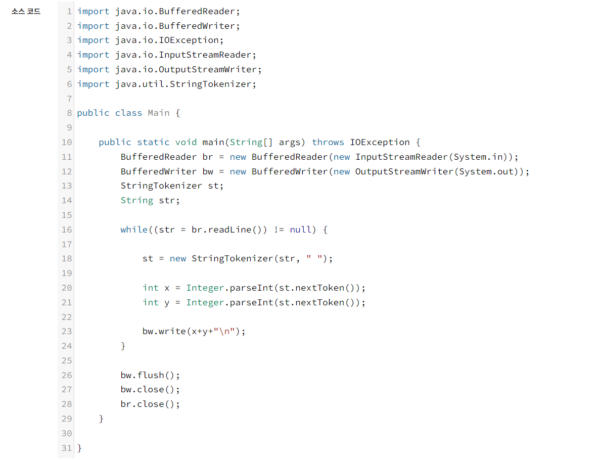 이 문제에서 주의해야 할 것은 readLine()을 통해 입력받은 값은 String형이며, 값이 입력되지 않은 경우에는 null값이 들어온다는 점이다. 그렇기 때문에 while문 안의 조건에 readLine()을 통해 입력받은 값이 null인지 여부를 조건으로 설정하여, null이 아닌 경우에만 반복문이 수행되도록 하였다.
