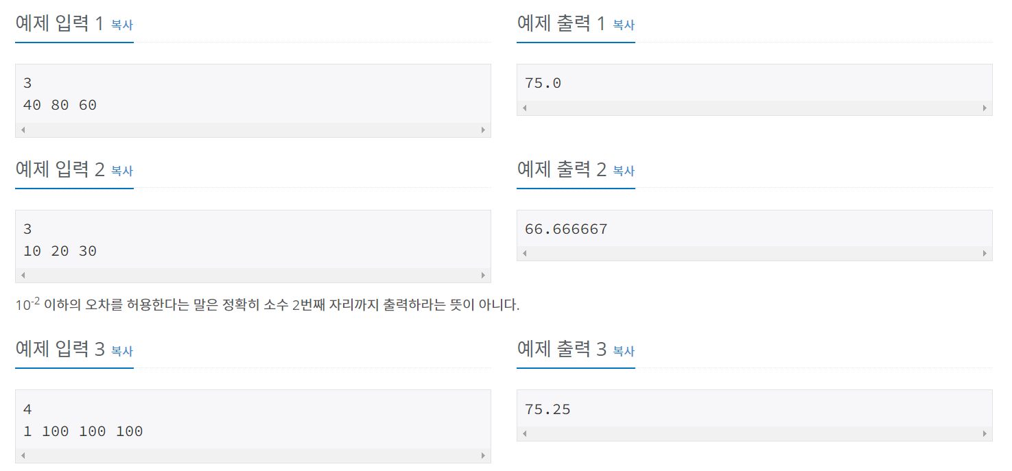 첫 줄에서 총 몇 과목이었는지 N이 주어지고, 둘째줄에서 각 과목의 실제성적이 주어지면 그 중 최댓값을 선별하여 조작된 성적값을 산출하면 된다. 그리고 이렇게 조작된 성적으로 새로운 과목평균점수를 산출하는 문제이다.