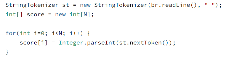 두 번째 줄에서 입력받은 각 과목의 성적들은 띄어쓰기로 구분된 한 줄 짜리 데이터이므로, StringTokenizer를 이용해 공백을 기준으로 각 토큰으로 나누어 저장한다. 그리고 직전에 입력받아놓은 과목의 갯수 N개만큼 반복문을 돌려 score배열에 토큰에 저장되어있는 점수들을 한개씩 저장한다.