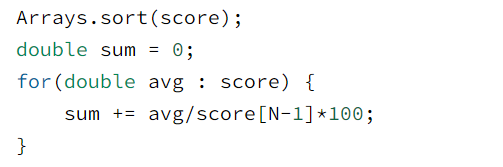 Arrays.sort() 메소드를 이용하여 배열 안의 숫자들을 오름차순 정렬하면 배열의 가장 마지막 값이 최댓값이 되도록 할 수 있다. 이제 실제점수/최댓값*100 의 형식으로 점수들을 조작해야 하므로, 반복문을 돌려 조작된 점수로 계산한 후 그 값들이 모두 sum변수에 더하여 조작된 점수의 합을 계산한다.