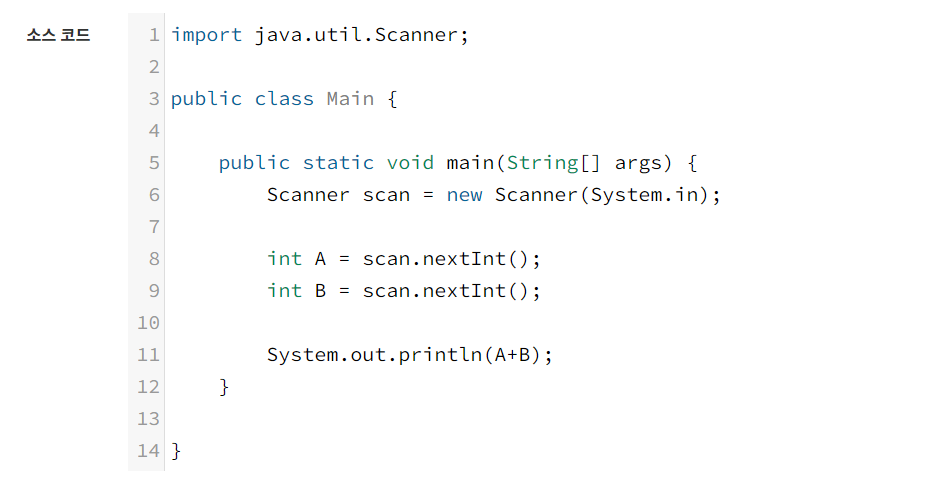 이번 문제는 두 개의 숫자를 입력받아 그 합을 출력하는 문제이다. 내가 기억하기로는 값을 입력받는 방법에 여러가지가 있었던 것 같은데 레퍼런스 없이 바로 적으려니 기억나는 것이 Scanner밖에 없어서 이 방법을 사용했다.