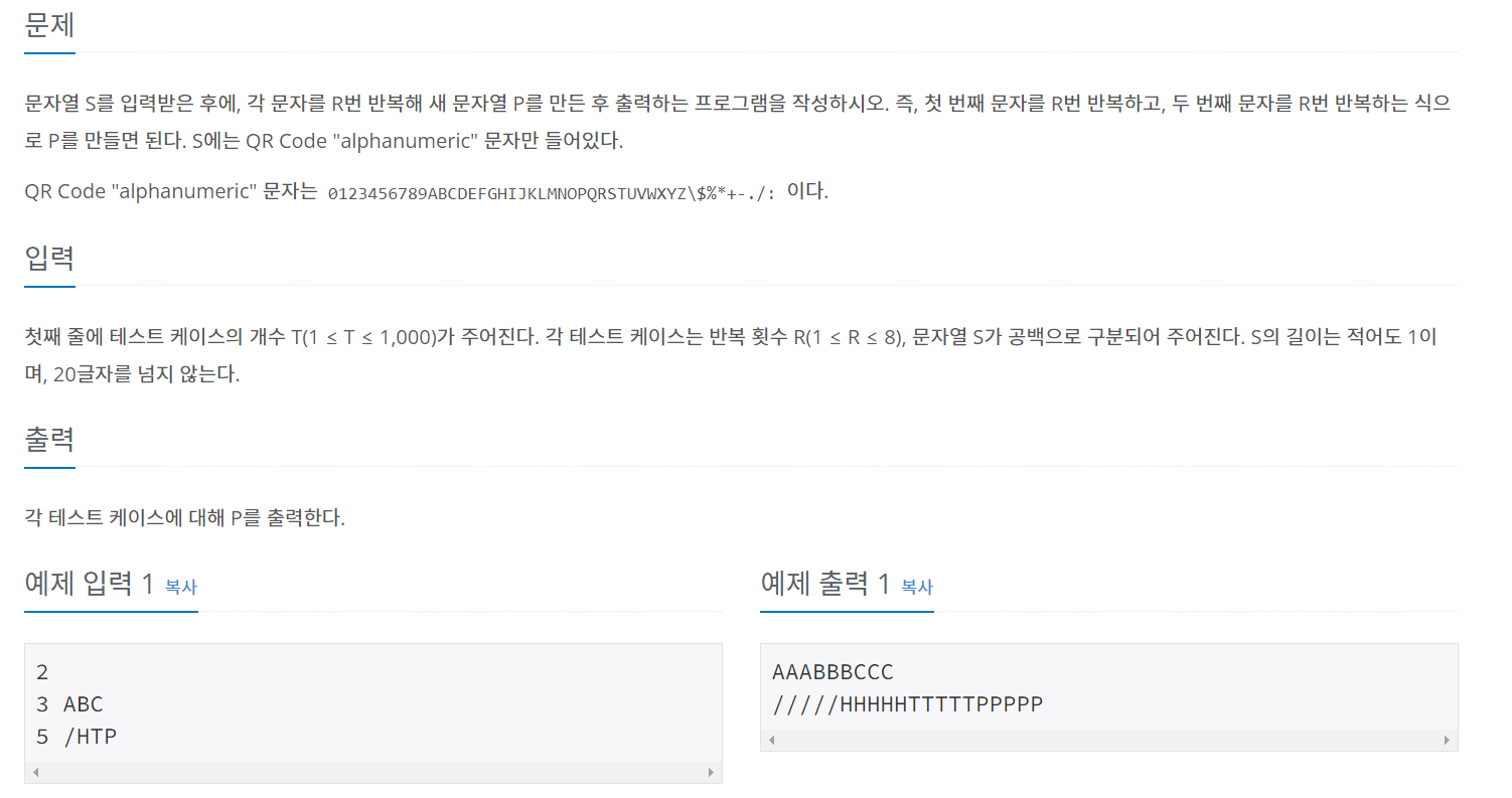 각 케이스의 입력값은 "반복할횟수 반복할문자열" 의 모양으로 입력받는다.(두 값은 띄어쓰기로 구분)