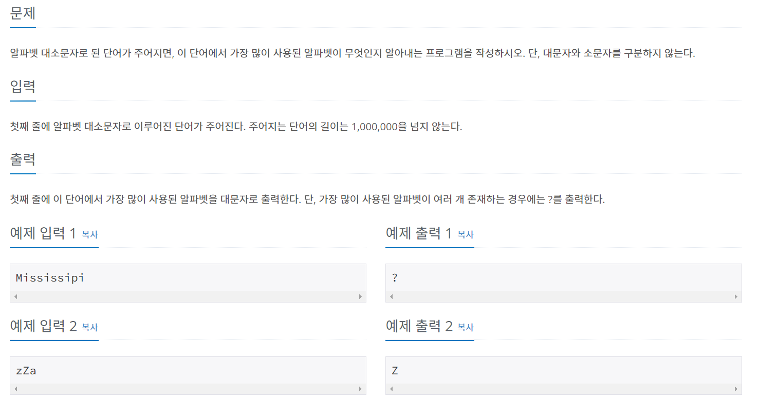 대소문자가 섞여있는 알파벳 문자열이 주어지고, 이 단어에서 가장 많이 사용된 알파벳을 알아내는 문제이다.