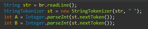 BufferedReader를 이용하여 입력받은 값은 String형이며, 두 개의 값을 한번에 입력받았으므로 각각 분리하여 계산하기 위해 StringTokenizer를 사용한다.