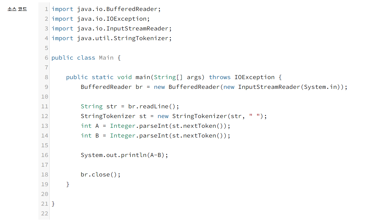 이번 문제는 저번 문제와 같이 두 숫자 값을 입력받아 계산값을 내는 동일 유형의 문제인데, 저번 포스팅에서는 간단하게 Scanner를 이용해서 풀어봤지만 이번에는 저번에 참고하겠다고 첨부했던 포스팅을 보고 BufferedReader와 StringTokenizer를 이용해서 풀어봤다.