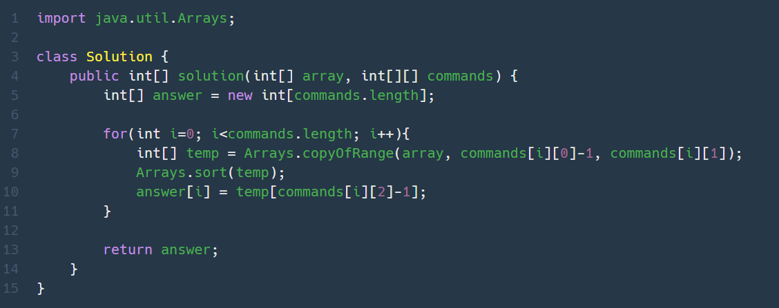 반복문을 사용해서 해결하는 문제이며, 배열을 정렬하는 Arrays.sort() 메소드와 배열 내부 특정 위치의 값들을 추출할 때 쓸 수 있는 Arrays.copyOfRange() 메소드를 사용하였다.